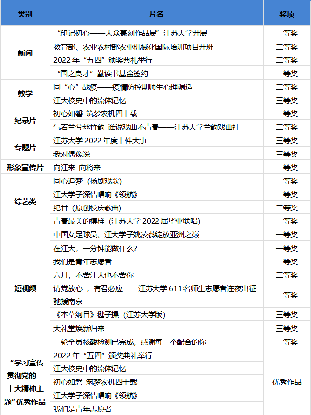 7月11日至12日,2022-2023高校影視作品交流展映活動在無錫舉行,活動由中國教育電視協會高校電視專業委員會主辦,江南大學承辦。我校共獲得28個獎項,其中一等獎4項、二等獎11項、三等獎8項、“學習宣傳貫徹黨的二十大精神”主題優秀作品5項。