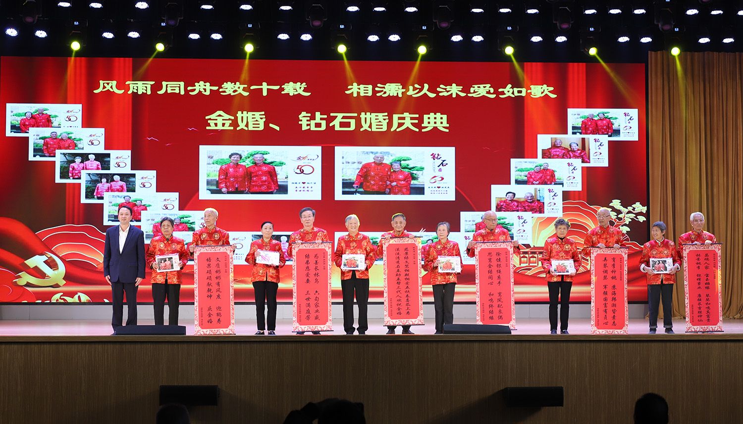 學校今年共有鉆石婚夫婦14對、金婚夫婦9對。聯歡會上,任旭東向鉆石婚和金婚夫婦代表贈送了嵌名楹聯和水晶紀念照。