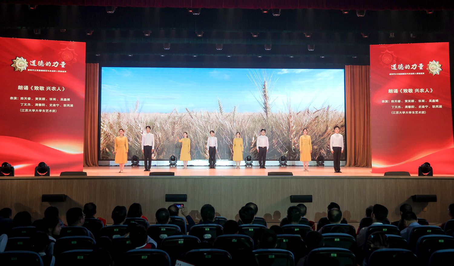 全國道德模范、江蘇省道德模范、江蘇省道德模范提名獎代表,中國好人、江蘇好人、鎮(zhèn)江好人、句容好人代表,江蘇省美德基金會、省委宣傳部、市委宣傳部、市委教育工委、江蘇省廣播電視總臺有關(guān)領(lǐng)導(dǎo),校黨委書記李洪波,校黨委副書記張濟(jì)建,副校長楊道建,校黨委常委、宣傳部部長、統(tǒng)戰(zhàn)部部長吳麟麟,學(xué)校有關(guān)職能部門和學(xué)院領(lǐng)導(dǎo),江蘇大學(xué)、江蘇科技大學(xué)、鎮(zhèn)江高專、江蘇大學(xué)附屬學(xué)校師生代表等現(xiàn)場觀看巡演。