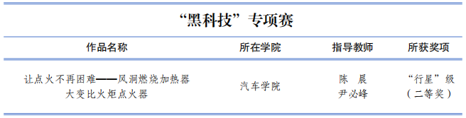 經過激烈角逐,我校共有17項學生作品獲獎。其中,主體賽6項作品獲獎,包括特等獎1項、一等獎1項、二等獎2項、三等獎2項。“揭榜掛帥”專項賽10項作品獲獎,包括特等獎2項、一等獎4項、二等獎1項、三等獎3項,其中1項作品以全國最高分獲得擂主(特等獎)。“黑科技”專項賽1項作品獲“行星”級。