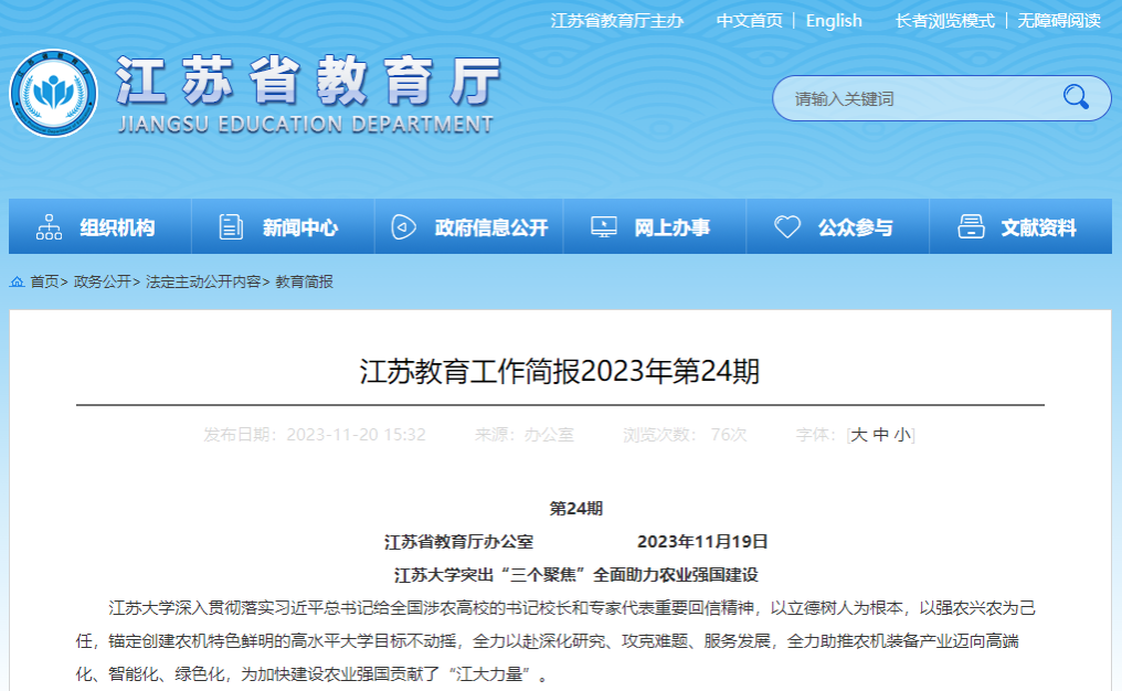 11月20日,江蘇省教育廳《江蘇教育工作簡報》(2023年第24期)以《江蘇大學(xué)突出“三個聚焦”全面助力農(nóng)業(yè)強國建設(shè)》為題,從“聚焦深化科技創(chuàng)新,加快打造農(nóng)機研究新高地”“聚焦破解行業(yè)難題,不斷實現(xiàn)農(nóng)機技術(shù)新突破”“聚焦服務(wù)鄉(xiāng)村振興,全面提升農(nóng)機裝備新貢獻(xiàn)”三個方面,專題報道了我校科技強農(nóng)興農(nóng)工作。