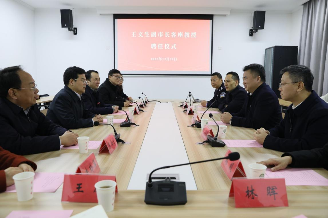 王文生客座教授聘任儀式在一站式服務中心會議室舉行。李洪波為王文生頒授了江蘇大學客座教授聘書并佩戴江蘇大學校徽。他向鎮江市公安局一直以來對我校安全穩定工作的支持與關心表示感謝,希望進一步加強警校合作,助力我校法治人才培養質量提升。