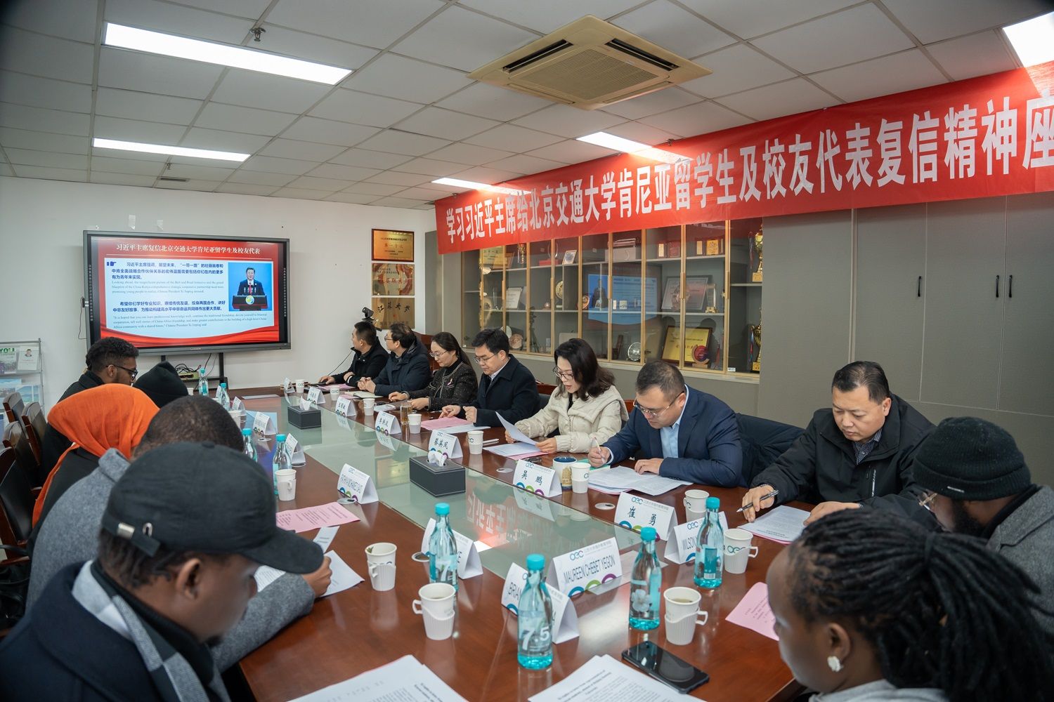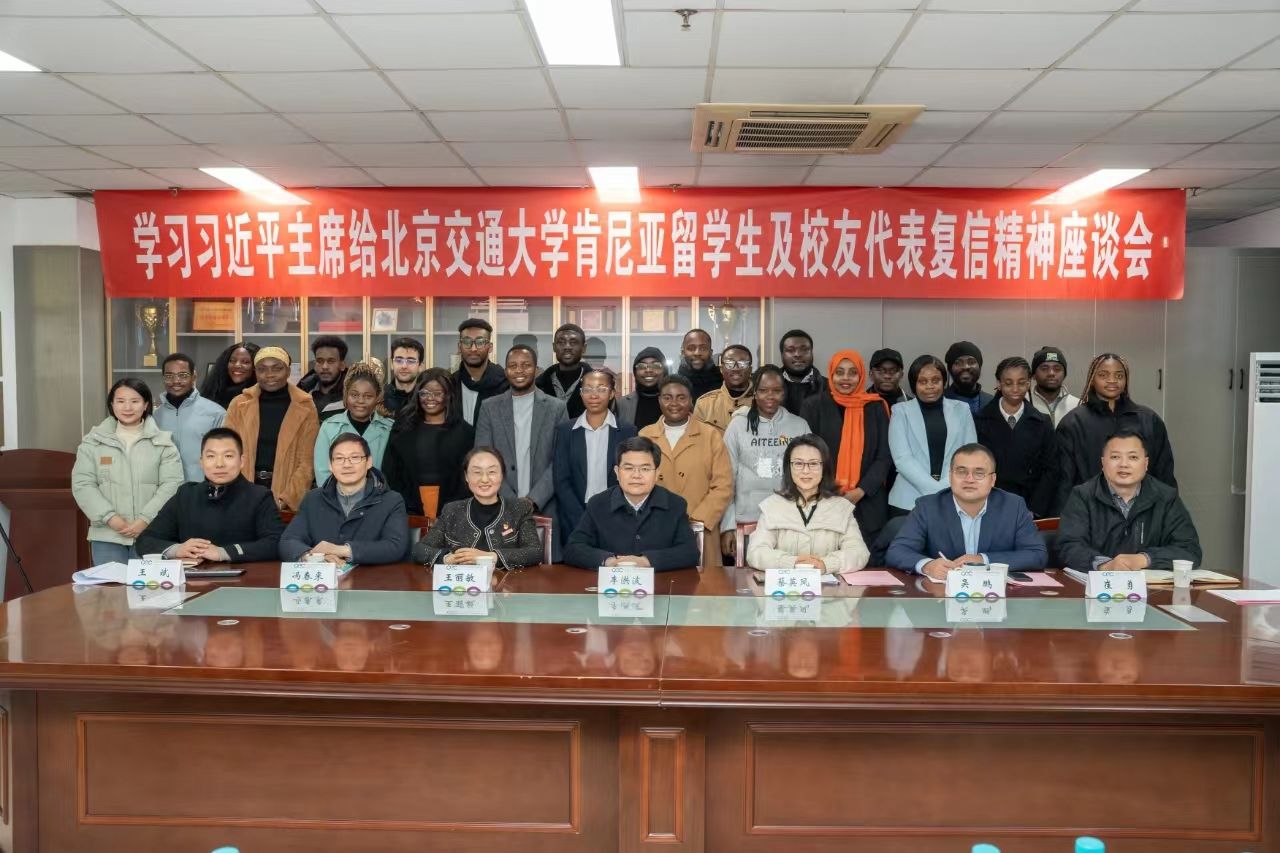 1月25日,來華留學生學習習近平主席給北京交通大學肯尼亞留學生及校友代表復信精神座談會舉行。校黨委書記李洪波,校黨委常委、副校長蔡英鳳,海外教育學院全體院領導、教職工、肯尼亞及其他非洲籍留學生代表參加座談,座談會由海外教育學院直屬黨支部書記王麗敏主持。