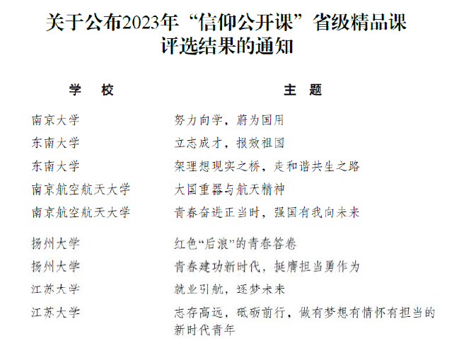 近日,共青團江蘇省委公布了2023年“信仰公開課”省級精品課評選結果,我校申報的2門課程均獲評省級精品課。
