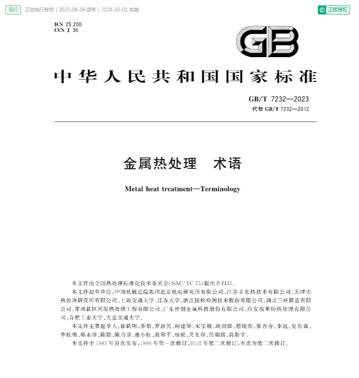 日前,由我校金屬材料工程專業教師羅新民、程曉農等參與修訂的國家標準《金屬熱處理 術語GB/T 7232-2023》正式發布,于2024年3月1日起實施。這次國家標準修訂工作是金屬材料工程專業的重要工程教育實踐成果之一。
