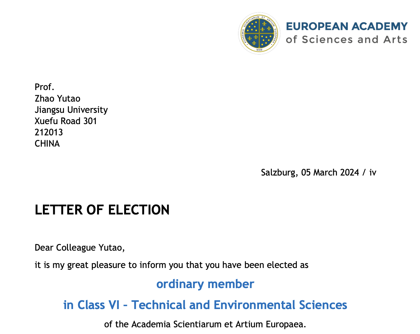 近日,歐洲科學與藝術院(European Academy of Sciences and Arts)院長Prof. Klaus Mainzer發來賀信:經理事會投票,江蘇大學材料科學與工程學院趙玉濤教授當選歐洲科學與藝術院院士(技術與環境科學學部)。