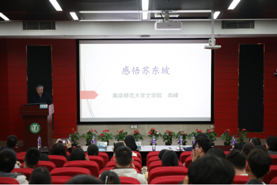 開幕式后,高峰作題為《感悟蘇東坡》的講座,他從躬耕東坡、積極融入、尋找樂趣、照亮他人等方面詮釋了蘇東坡的曠達樂觀,通過詩中表現出的飲食文化內容展現蘇東坡苦中作樂的精神境界和人格魅力。
