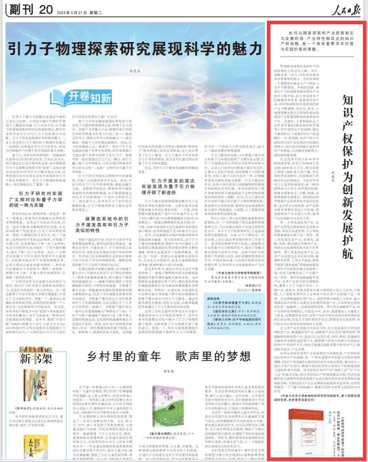 5月21日,北京大學新結構經濟學研究院院長,第十四屆全國政協常委、經濟委員會副主任林毅夫教授在人民日報撰文《知識產權保護為創新發展護航》,向社會各界推薦由江蘇大學知識產權學院直屬黨支部書記、新結構經濟學知識產權研究院執行院長唐恒教授,以及北京大學新結構經濟學研究院學術副院長王勇、趙秋運博士合著的《新結構經濟學視角下的中國知識產權戰略:理論與案例》一書。
