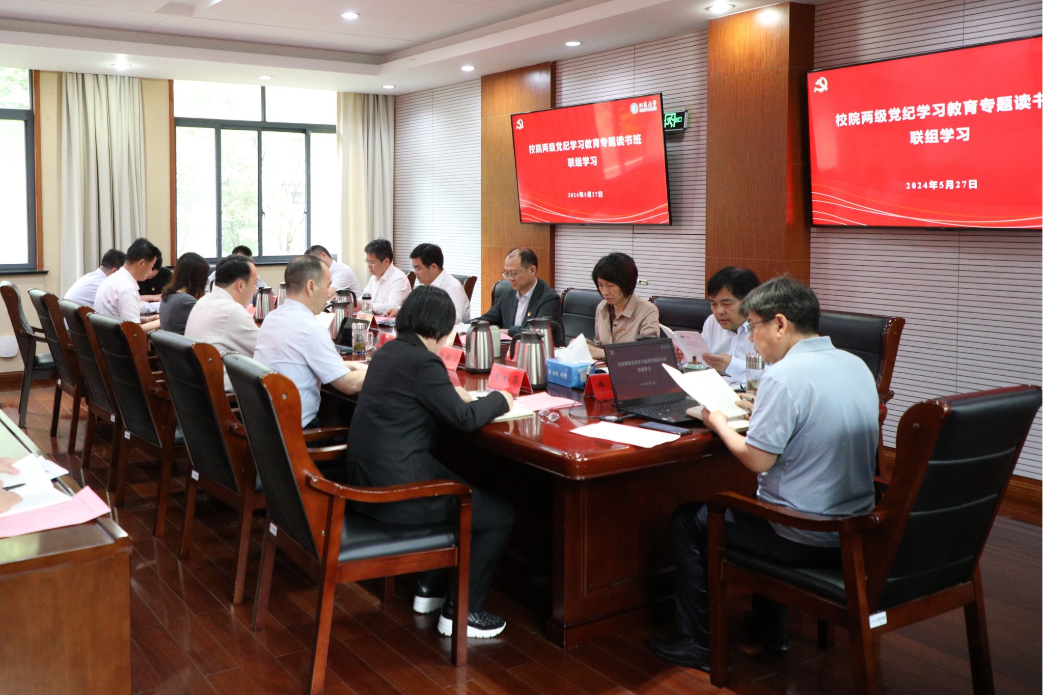 5月27日上午,校院兩級黨紀學習教育專題讀書班聯組學習會在行政一號樓201會議室舉行。校黨委、法學院黨委理論學習中心組成員參加學習會。聯組學習會由校黨委書記李洪波主持。