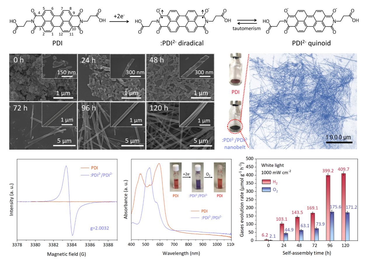 研究工作將苝酰亞胺(Perylene diimide,PDI)轉變為能夠在模擬太陽光下全分解水的全有機光催化劑。通過將PDI自由基(:PDI2-)和其醌式異構體(PDI2-)自組裝合成自由基全有機半導體催化劑,利用其內部相鄰自由基分子的電子自旋耦合,可以誘導特殊的三重態聚變上轉移過程,從而產生能夠與水分子作用的S1激發態。自組裝形成的自由基-醌式雜化分子(:PDI2-/PDI2-)納米帶在光激發過程中能夠通過自旋耦合產生較長壽命的三重態激子,使其在AM 1.5G模擬太陽光下將水分解為氫氣和氧氣,在450 nm~850 nm波長范圍內的平均表觀量子效率(AQY)為1.5%,太陽能氫能轉換效率(STH)為0.0806%。該研究是首個不含金屬的全有機光催化全分解水反應體系,這種全有機自旋雜化結構為設計一系列用于光催化、太陽能電池、傳感器和發光材料的全新光響應有機半導體提供了新途徑。