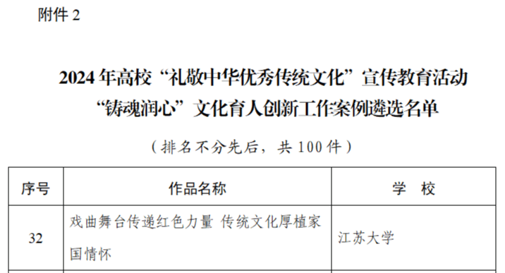 近日,教育部公布了2024年高校“禮敬中華優秀傳統文化”宣傳教育活動結果,黨委宣傳部報送的《戲曲舞臺傳遞紅色力量 傳統文化厚植家國情懷》入選“鑄魂潤心”文化育人創新工作案例。