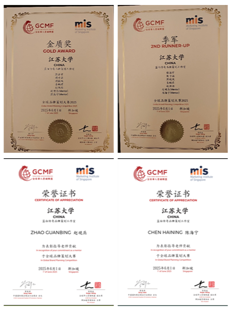 6月1日,2025年(新加坡)全球品牌策劃大賽在新加坡管理大學舉辦,由我校知識產權學院5名本科生組成的“藍白傳奇品牌策劃工作室”獲金質獎、季軍,指導教師趙觀兵、陳海寧受到大賽表彰。