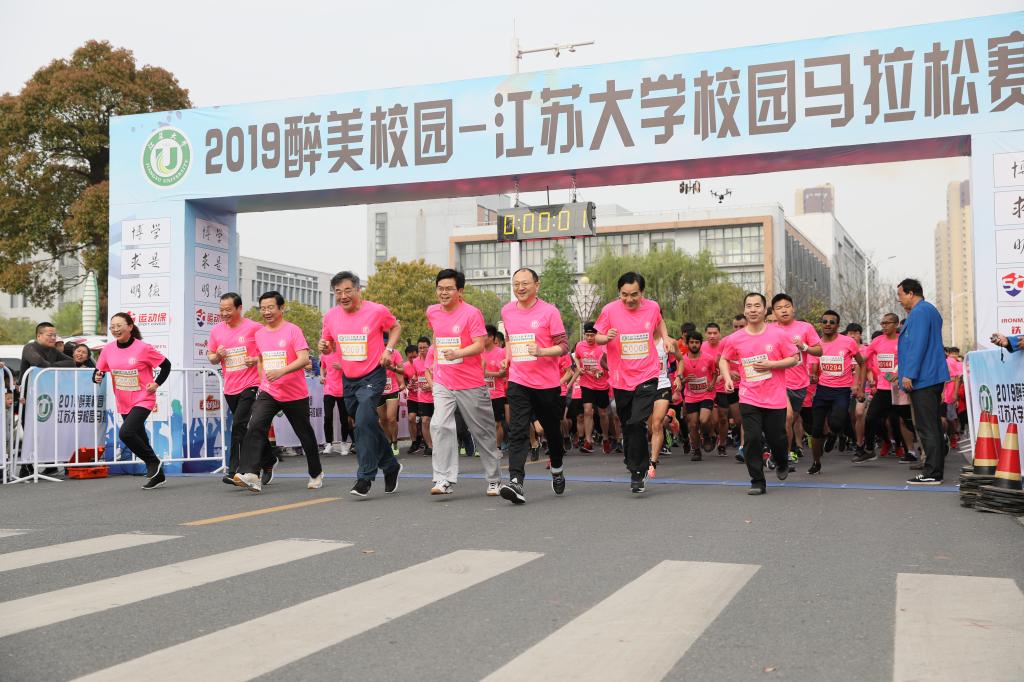 袁壽其致開幕詞,他代表學校黨委、行政,向為賽事作出貢獻的全體工作人員、志愿者、啦啦隊以及贊助方表示感謝,向參加比賽的師生和校友致以問候和祝愿。他指出,馬拉松賽事不僅是一項體育運動,更是一堂內(nèi)涵豐富的育人課程,其所蘊含的“生命在于運動”“成功貴在堅持”等人生哲理早已深入人心、融入文化,成為寶貴的教育資源。去年首屆“醉美校園”馬拉松比賽,受到了廣大師生及校友的熱烈歡迎和廣泛好評。2019校園馬拉松比賽在報名開始的三天內(nèi),報名人數(shù)就達到2200人的預設限額,充分體現(xiàn)了廣大師生享受運動、崇尚健康、突破自我、追求卓越的高昂熱情,這正是學校事業(yè)不斷進步所需要的強大動力。他指出,2019醉美校園--江蘇大學校園馬拉松賽,分為16公里和8公里竟速跑以及3公里健步江大三個項目。在周長3公里的賽道周圍,最美江大可謂盡入眼簾,相信大家在這如詩似畫的賽道中,不僅能夠享受運動之樂,更能領略江大之美、平添愛校之情!他最后勉勵參賽選手,人生的馬拉松不在于起點的爆發(fā),更在于過程中的堅持,鼓勵大家在這條穿越美景的跑道上,跑出速度和激情,跑出活力與風采,跑出超越極限、堅韌不拔的馬拉松精神。