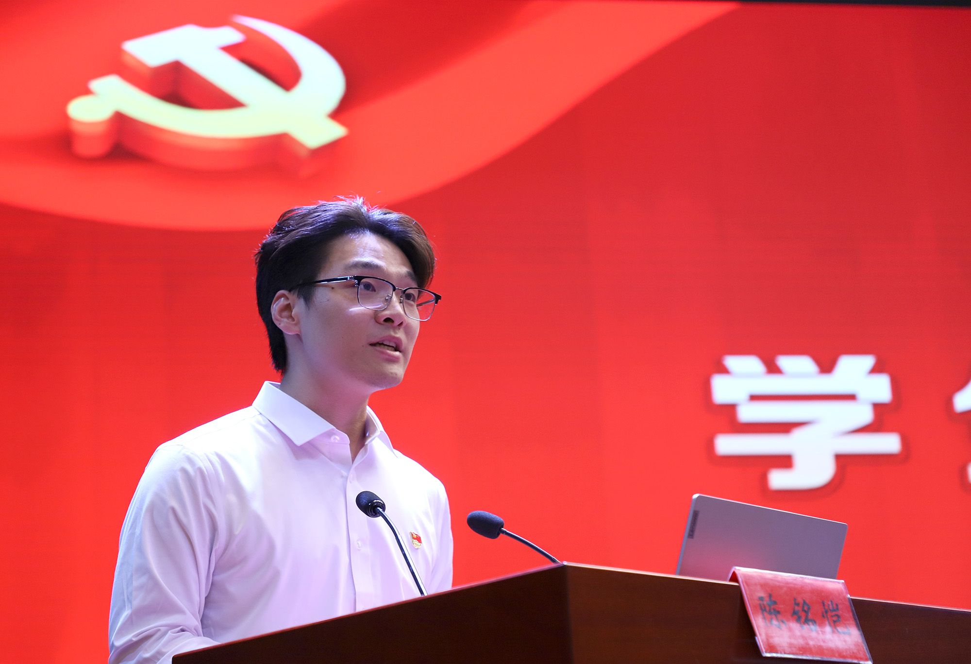 畢業生黨員代表、醫學院陳銘愷同學在發言中表示,重溫入黨誓詞,以鏗鏘誓言叩問初心,以如磐信念照亮征程,既是對紅色基因的賡續傳承,也是對時代使命的莊嚴承諾。他號召同學們懷愛國之心、立報國之志、增強國之能,以“功成不必在我”的理想信念和“功成必定有我”的青春擔當,在祖國建設偉大征程上奮楫篤行、勇攀高峰。