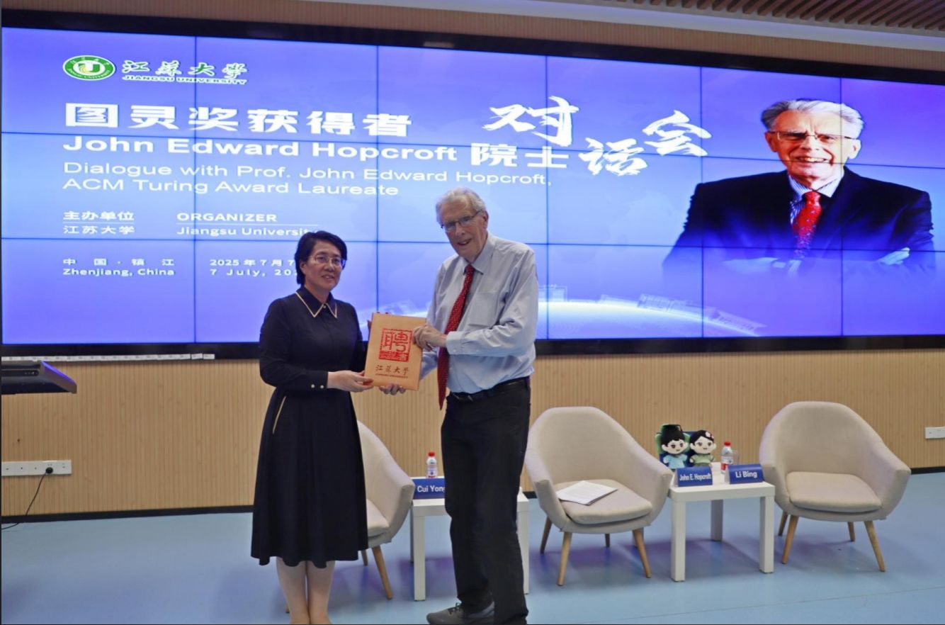 對話會上,邢衛紅向約翰·愛德華·霍普克羅夫特教授頒發“江蘇大學學習科學與技術交叉學科帶頭人”聘書。