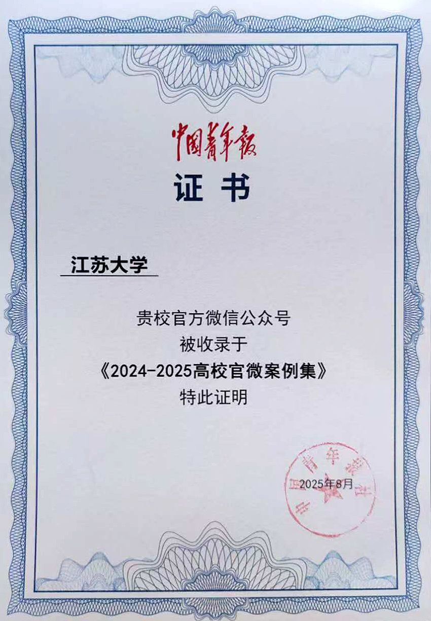 近日,由中國青年報社主辦的“青春為中國式現代化挺膺擔當”科技賦能高校融媒體育人實效研討會召開。會上公布了年度高校新聞扶持計劃案例,江蘇大學新媒體中心報送的《厚植為“農”情懷》獲評年度高校融合創新新聞專題作品,成果收錄于《高校新聞扶持計劃案例集(2025)》,江蘇大學官方微信被收錄于《2024-2025高校官微案例集》。