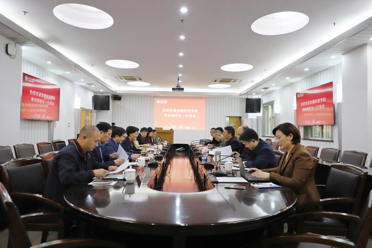 10月30日,安徽科技學院校長李升和、副校長王孝義一行來校調研,校長邢衛紅接待來訪一行。