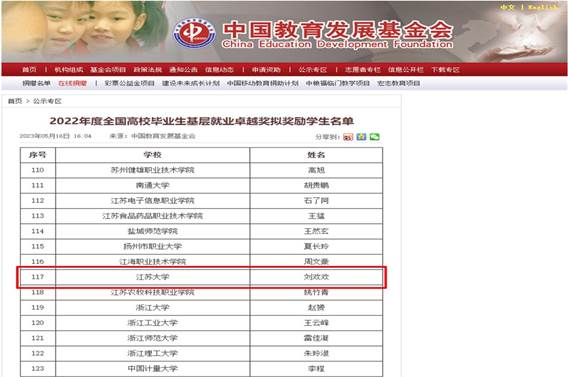 近日,中國教育發(fā)展基金會公布了《2022年度全國高校畢業(yè)生基層就業(yè)卓越獎擬獎勵學生名單》,我校2015屆畢業(yè)生劉歡歡入選。