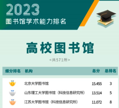 6月19日,圖書(shū)館學(xué)術(shù)評(píng)價(jià)課題組聯(lián)合新文科專委會(huì)正式發(fā)布“2023圖書(shū)館學(xué)術(shù)能力排名”。本次共統(tǒng)計(jì)圖書(shū)情報(bào)類機(jī)構(gòu)782所,上榜機(jī)構(gòu)為234所(前30%),江蘇大學(xué)圖書(shū)館表現(xiàn)優(yōu)異,位列高校系統(tǒng)第三名。