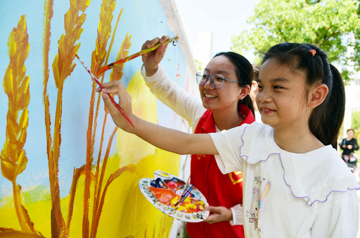 近日,江蘇省鎮(zhèn)江市潤(rùn)州區(qū)官塘橋街道平山村聯(lián)合江蘇大學(xué)志愿者帶著村里的孩子一起在墻上描繪綠色生態(tài)、幸福生活主題墻畫(huà),扮靚美麗鄉(xiāng)村。