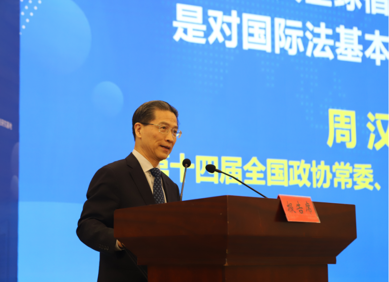 第十四屆全國政協常委、上海公共外交協會會長周漢民在主旨發言中表示,“三大全球倡議”是習近平主席提出的人類命運共同體的全面展開和深入闡述,中國提出的 “共商、共建、共享”原則被載入了聯合國安理會和聯合國專門會議等會議決議文件,是對國際法的新貢獻。