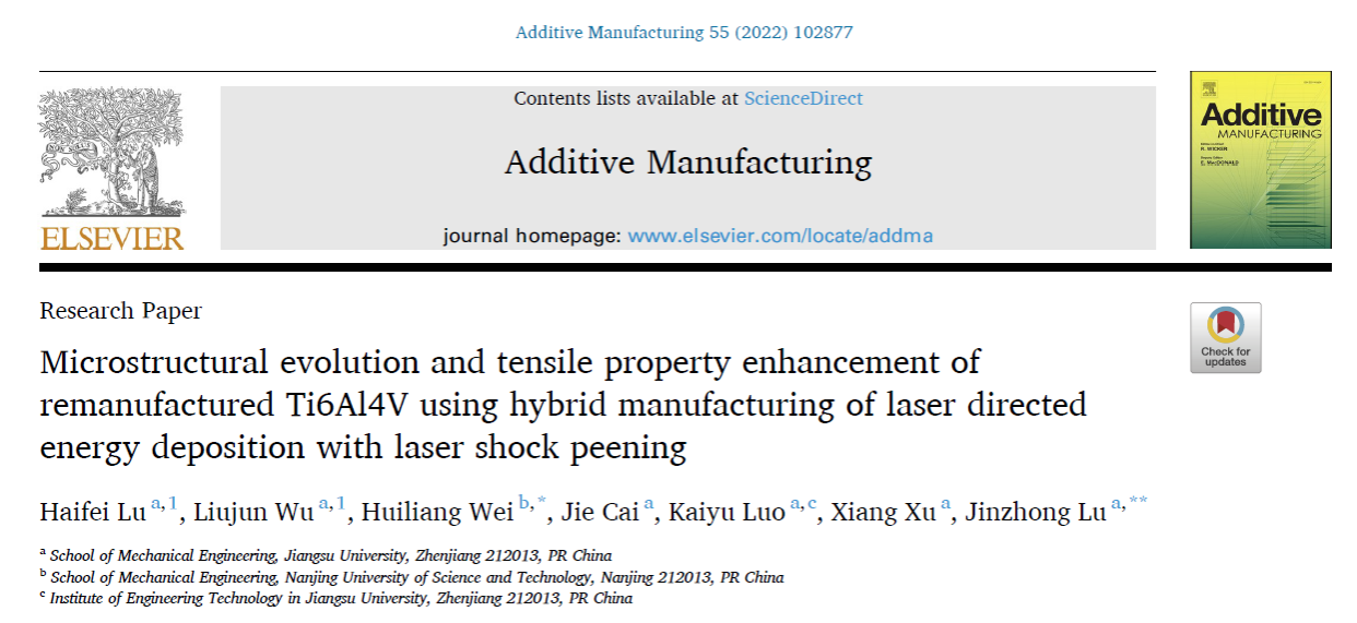 近日,經初評推薦、資格審查、專業評審、綜合評審等程序,機械工程學院魯金忠教授團隊發表在《Additive Manufacturing》上的SCI高被引論文“Microstructural evolution and tensile property enhancement of remanufactured Ti6Al4V using hybrid manufacturing of laser directed energy deposition with laser shock peening(激光熱力交互沉積再制造Ti6Al4V合金微觀組織演變和拉伸性能強化)”入選2024年江蘇省自然科學百篇優秀學術成果論文推選(江蘇大學唯一入選)。青年教師盧海飛副教授為第一作者,魯金忠和南京理工大學韋輝亮教授為共同通訊作者。該工作得到國家自然科學基金(51775250)等資助。