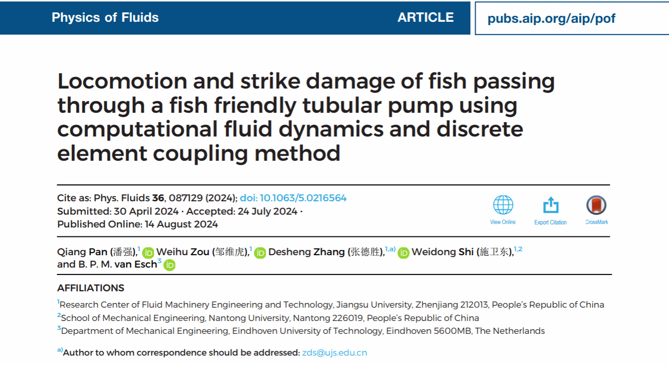 近日,我校流體機械工程技術(shù)研究中心張德勝教授團隊與荷蘭埃因霍溫理工大學巴特·范·埃施教授團隊合作,在流體領域Top期刊《流體物理》(Physics of Fluids)發(fā)表了題為“Locomotion and strike damage of fish passing through a fish friendly tubular pump using computational fluid dynamics and discrete element coupling method”的研究論文。青年教師潘強副教授為論文第一作者,張德勝為通訊作者。